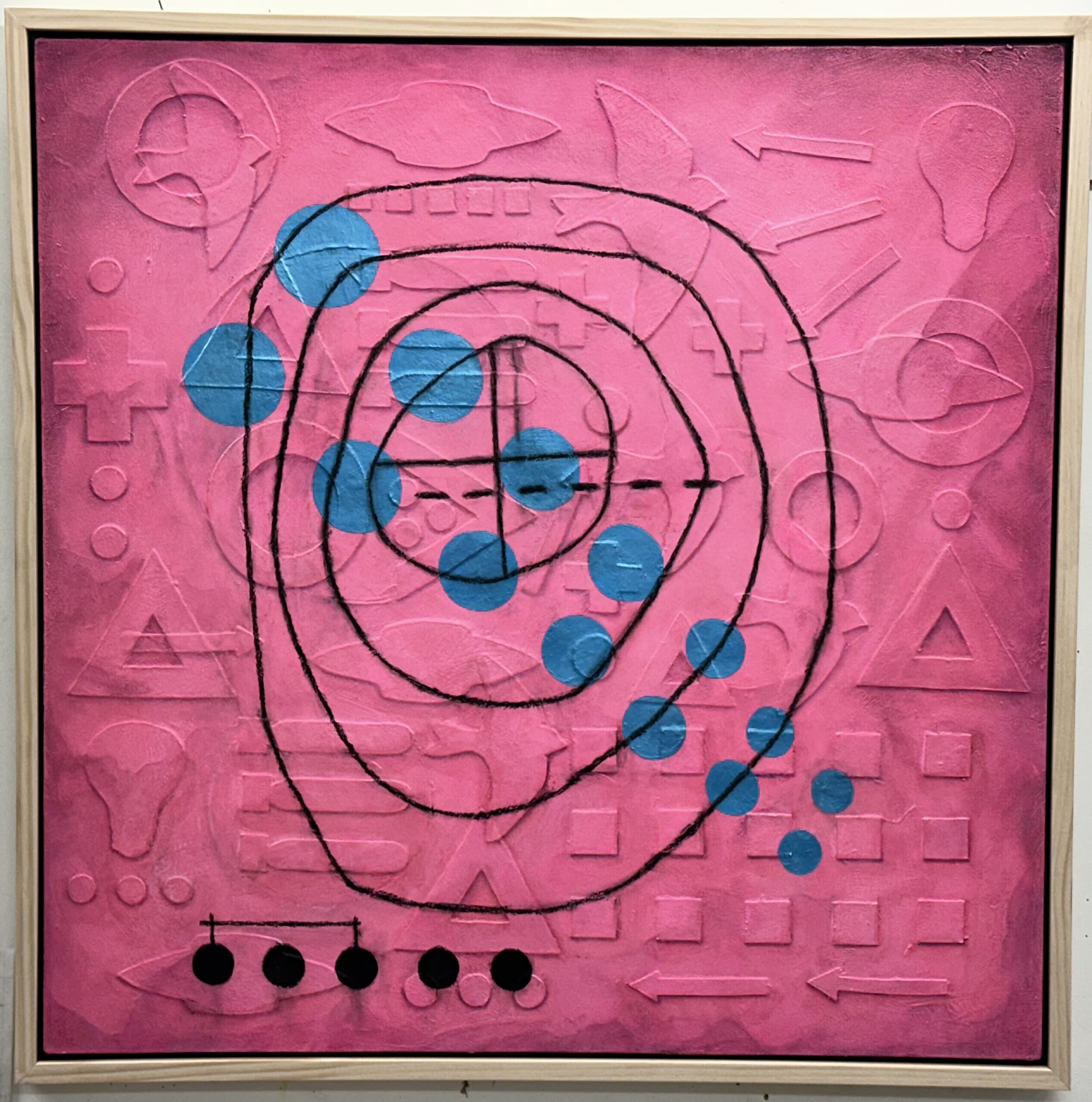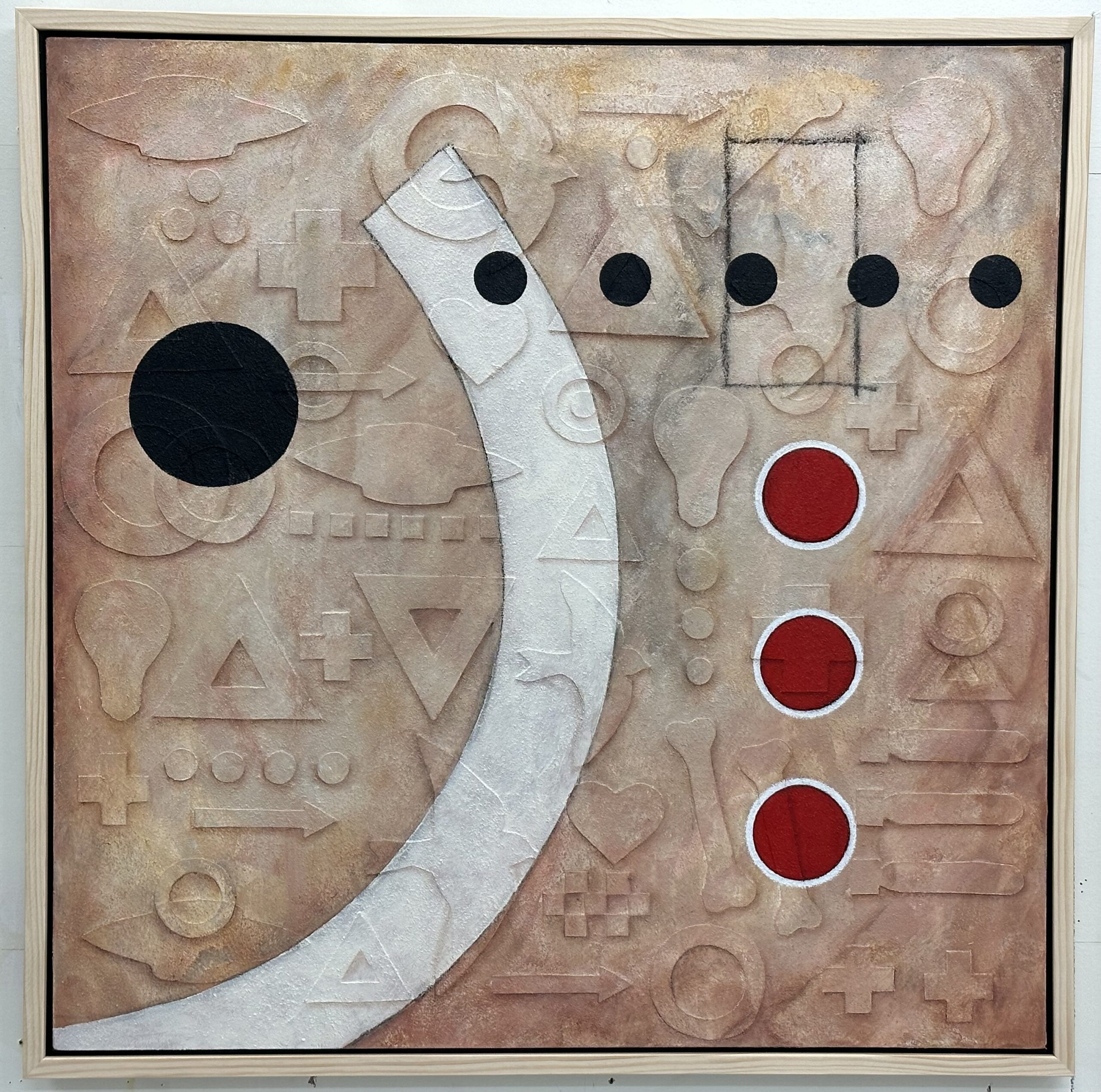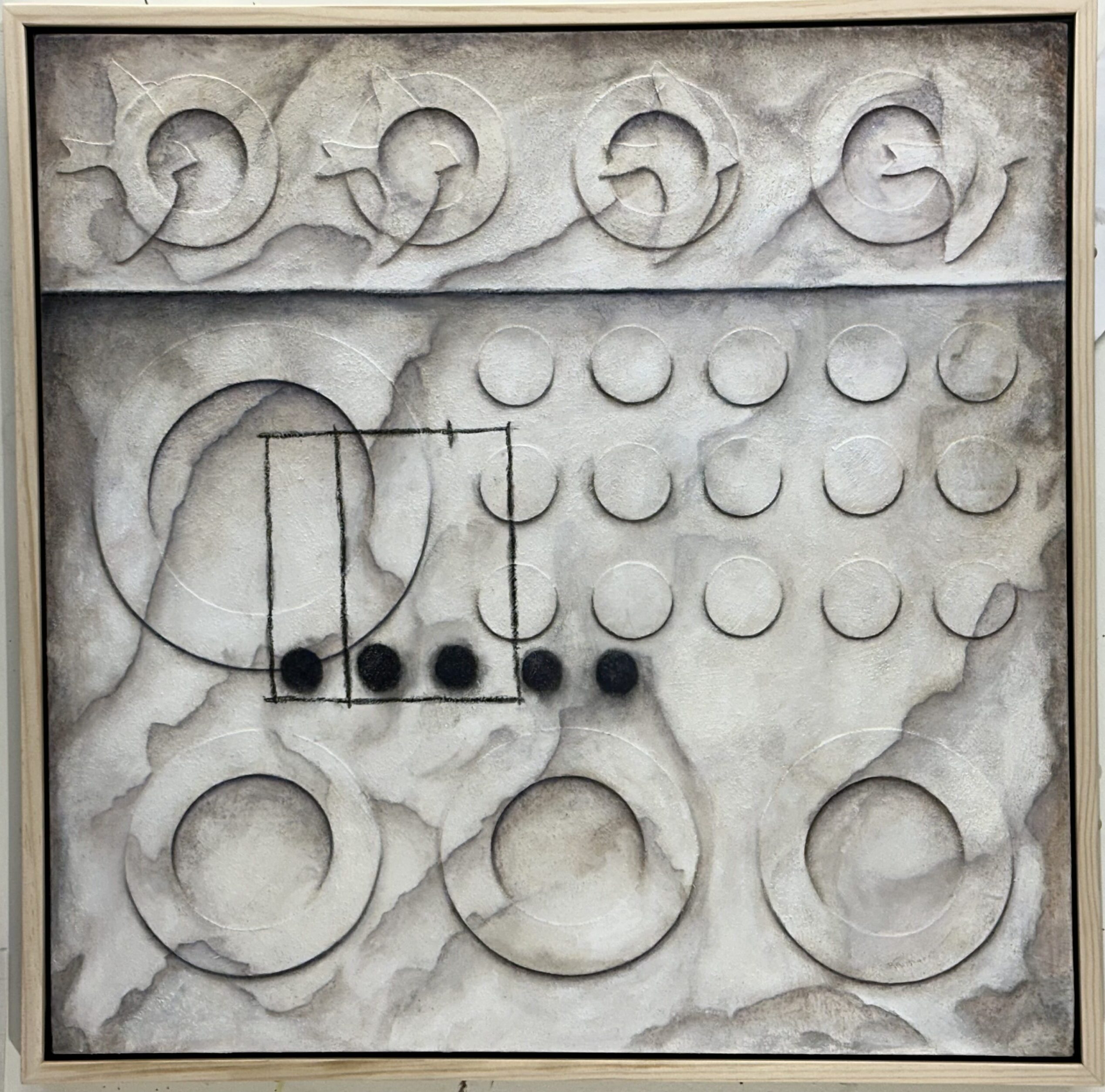The Organization of Predictable Events, 36"x36", acrylic, oil, charcol, on canvas, 2023