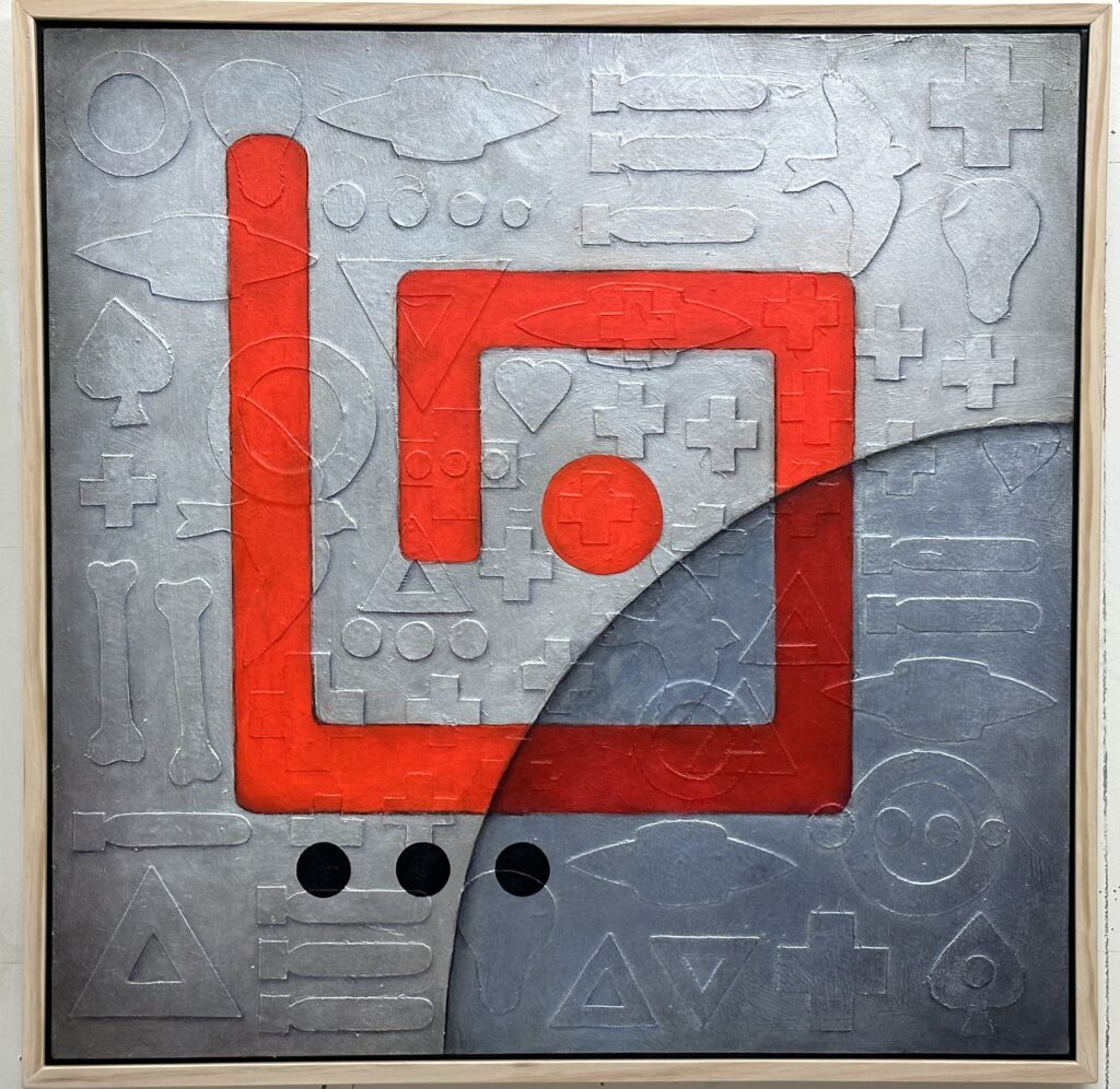 The Alignment of Atoms and Production of Steel, 36"x36", acrylic, oil, silver leaf, charcoal on canvas, 2024 (Private Collection)