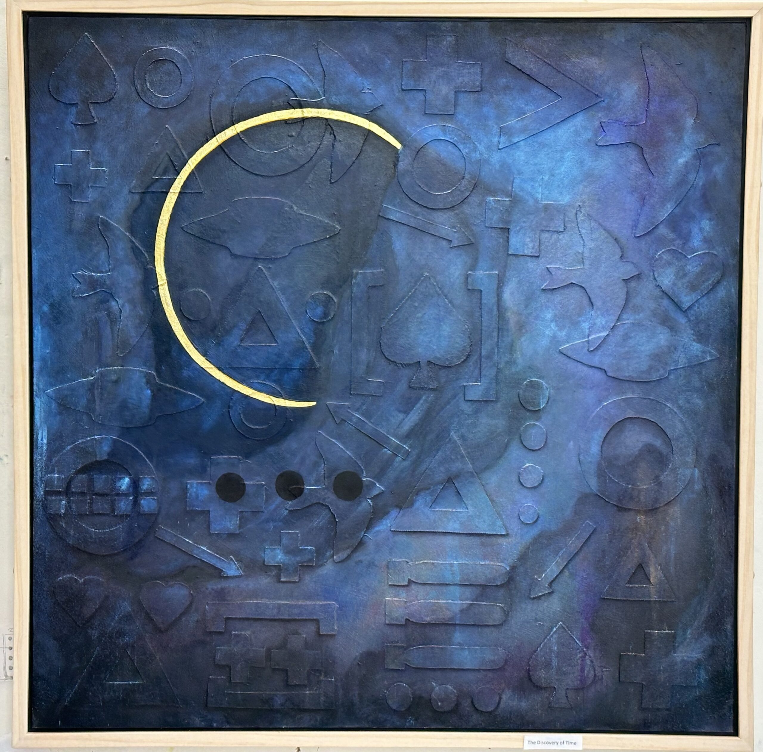 The Discovery of Time, 36"x36", acrylic, oil, charcoal, gold, on canvas, 2023