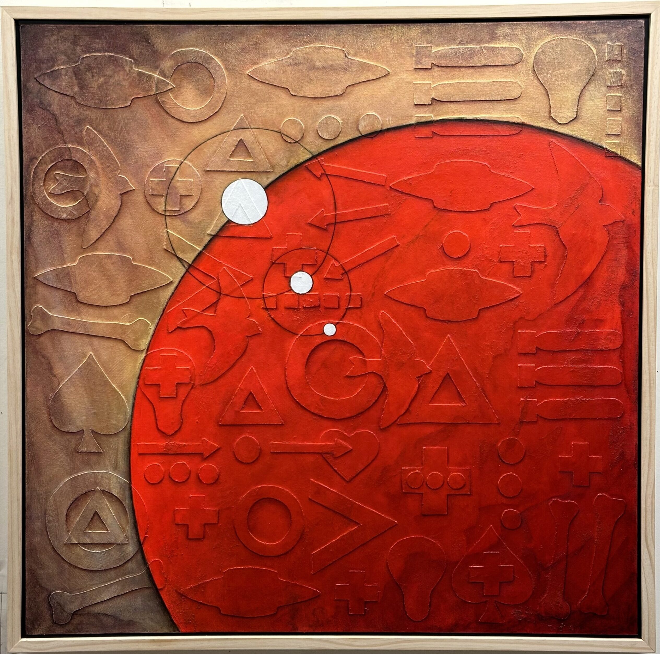 The Dawn of Weapons and Tools, 36"x36", acrylic, oil, gold, charcoal on canvas, 2023